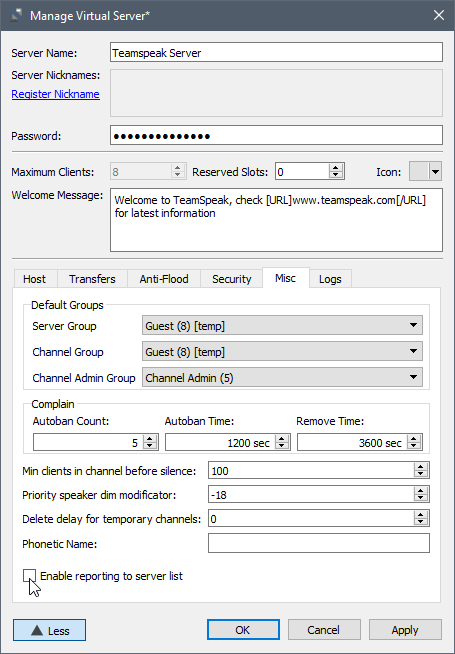 While in the Misc tab, you need to untick the “Enable reporting to server list†box.