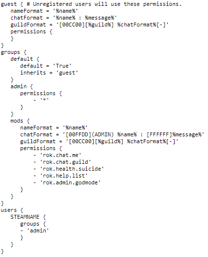 Here is an example configuration file with a user (STEAMNAME) setup as a mod with the permisison of 'godmode'
